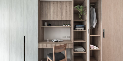 材質|系統櫃、實木皮、長虹玻璃、金屬鐵件和超耐磨木地板