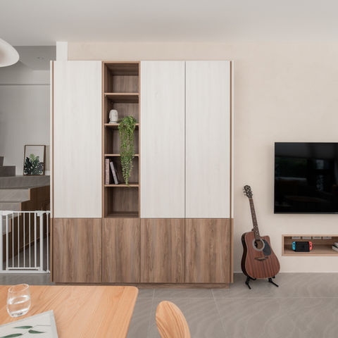 材質|木皮、人造石、系統櫃、義大利塗料、鐵件和超耐磨木地板